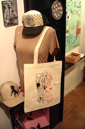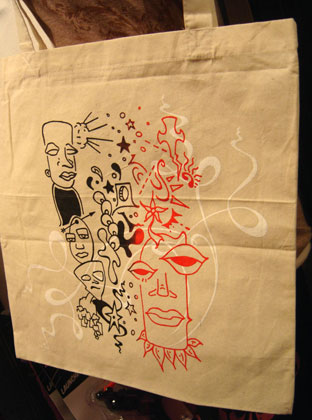 The design for this came from two different drawings. The whimsical lines printed in white is one drawing (printed in a different layout on each bag) and the main picture was a drawing from one of my sketchbooks, which was printed by mixing two colors ink (red and black) in the the screen at the same time, which gives the unique blending of colors that makes each bag in the series a true original.
