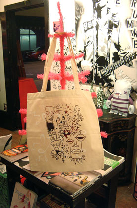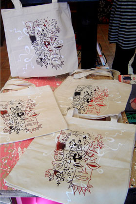 The design for this came from two different drawings. The whimsical lines printed in white is one drawing (printed in a different layout on each bag) and the main picture was a drawing from one of my sketchbooks, which was printed by mixing two colors ink (red and black) in the the screen at the same time, which gives the unique blending of colors that makes each bag in the series a true original.