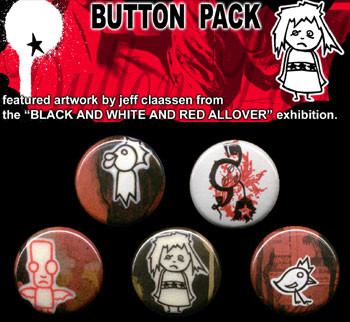 "Black And White And Red Allover Button Pack" 1" diameter pinback buttons 5 per pack, each design was taken from an original painting featured in the "Black And White And Red Allover" exhibition $6 per pack