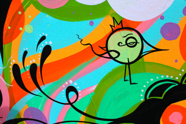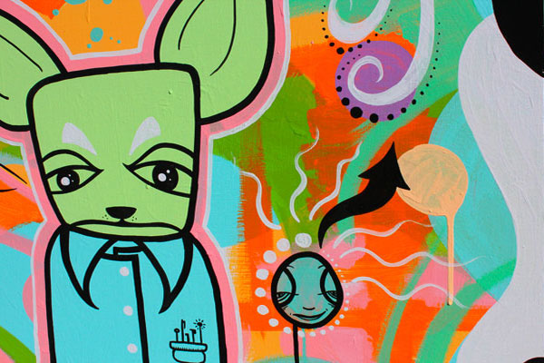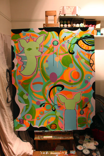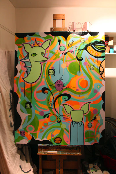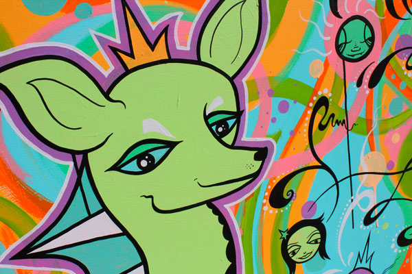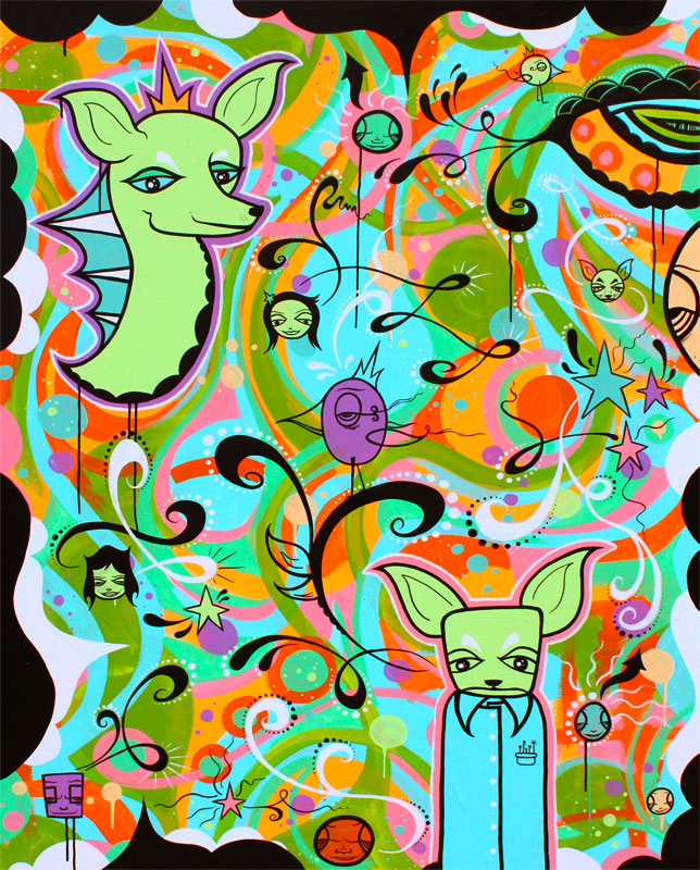 I finished this painting on Monday and I can’t remember the last time I worked so many consecutive hours on a single project. I was commissioned to paint this for a little girl’s birthday present. Yes, parents that commission original artwork for their kids are super awesome. Like super duper awesome! I was given free reign to paint what I wanted and execute it in my style with the one exception that I include the amazing Taco, who is the birthday girls’ pet chihuahua, somewhere in the painting.