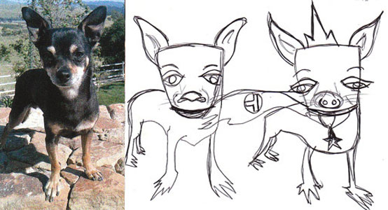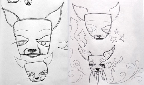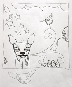 It’s my general rule that I don’t work from sketches and that I am very spontaneous when I make stuff. When it comes to painting chihuahua’s I break that rule. I don’t sketch on the actual canvas, but I do a few doodles to get a general idea of how to make the little creature. As you can see, Taco is very stylish. I thought Unicorn Taco would be sweet, but it didn’t make the cut for the final painting.